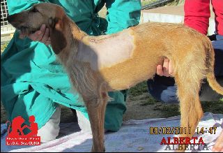 ALBERTA war die Hündin eines Jägers, wurde, wie fast immer, ausgebeutet, schlecht behandelt - und dann weggeschmissen. Sie lebte Jahre an der Kette, war Wind und Wetter und damit auch den brennenden Sonnenstrahlen auf SARDINIEN ausgesetzt. Als sich ein Geschwür auf ihrem Körper bildete, wurde sie zum Einschläfern im Tierheim von Olbia abgegeben. Dort sorgt sich seit Jahren Cosetta Prontu mit allem Nachdruck für die im Heim lebenden 700! Hunde. Eine Operation brachte gute Ergebnisse bei Alberta, aber, um die Krebsgeschwülste ganz zu besiegen, ist eine Radiotherapie in einer Spezialklinik in Sasso Marconi erforderlich.