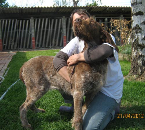 Die Frage lässt sich einfach beantworten: Kyra hat keinen Spaß am Jagen. Als hochkarätiger Jagdhund geboren und mit der typisch feinen Nase ausgestattet, wurde sie von einem Jäger angeschafft, der jahrelang versuchte, Kyra zu einem rassegerechten Einsatz zu bewegen. Als das so gar nicht klappte, wurde die Hündin an den nächsten Jäger abgegeben, der sich wiederum eine ganze Weile mit Kyras jagdlicher Lethargie abmühte. Irgendwann gab auch er auf und beschloss, dass Kyra ihr Leben lassen sollte. Denn ein Jagdhund, der nicht jagt, ist in Italien nicht das Schwarze unter den Fingernägeln wert. "Sinnlos" durchgefüttert wird er nie, er wird getötet.