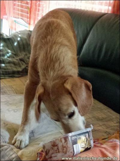 Natürlich habe ich darauf Acht gegeben, dass der Eis-Anteil etwas höher und dafür der Schokoladen-Anteil minimal war. Schließlich weiß ich, dass gerade dunkle Schokolade in einer bestimmten Menge für einen Hund tödlich sein kann. Aber die Menge Bananensplit insgesamt war so gering, dass Morando zwar seine Freude daran hatte, das Ausschlecken des Bechers aber für ihn nicht schädlich war und auch keine Gefahr darstellte.