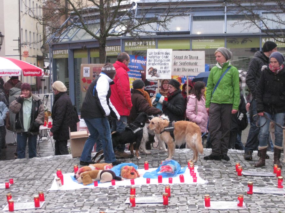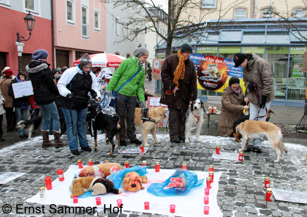 Ein Tapeziertisch war umfunktioniert als Infoboard mit vielen Plakaten, ein Banner war zwischen 2 Bäume gespannt, Unterschriftslisten lagen aus und mittendrin lagen auf einem "blut"-getränkten Handtuch "blutende" und verletzte Stoffhunde, umrahmt von vielen Kerzen. Ein Radio spielte Musik, per Laptop gab es Infos und zum Aufwärmen stand Tee bereit.