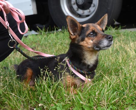 Zum Glück kamen wir schnell voran und trafen dann auch um 20 Uhr in Hirschberg ein, wo schon Ina, das Frauchen von Nana, auf ihr neues Familienmitglied wartete. Wir legten Nana ein Geschirr und zur Sicherheit auch ein Halsband um und setzten sie an einem ruhigen Platz auf die Wiese. Die Wiese fand Nana toll und wollte auch dort gekrabbelt werden. Als sie dann aber merkte, dass da an der Raststätte ein Bus mit Menschen kam, lag sie plötzlich in Hab-Acht-Stellung auf der Wiese und guckte, was um sie herum passiert.