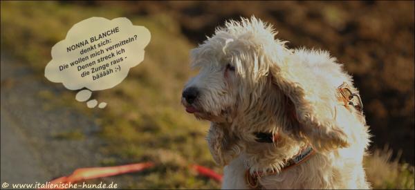 Letzthin war meine Mutter mit bei einem der Spaziergänge dabei und es war total erstaunlich, aber Nonna Blanche wich fast während des gesamten Spaziergangs nicht von ihrer Seite, war immer ganz nah neben ihr, obwohl ich sie an der Leine hatte. Sie scheint trotz ihren süßen Sturschädels einerseits ein ganz sensibler Hund zu sein. Meine Mutter war jedenfalls ebenso wie ich beeindruckt vom Verhalten der Hundeoma.